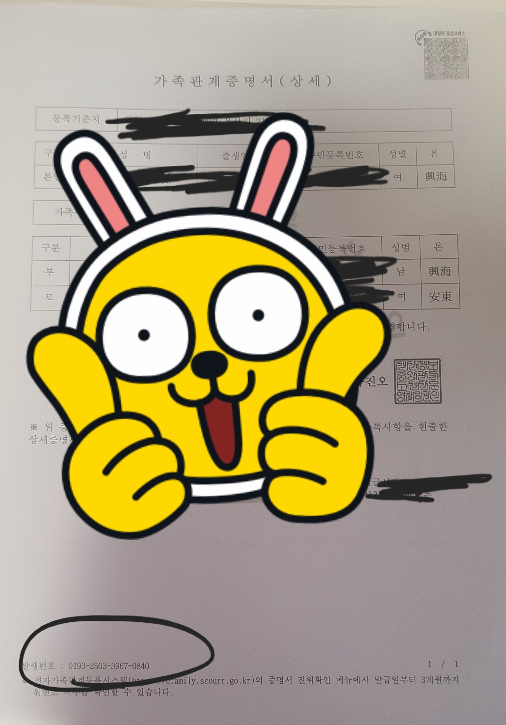 가족관계 증명서1부 기본증명서1부와 사진에 동그라미친 발행번호를 입력해야 한다.